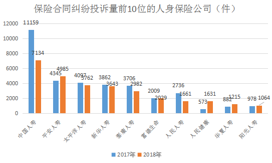 人身險公司方面,中國人壽、平安人壽、太平洋(4.280,0.08,1.90%)人壽位列前3,其中,中國人壽以7134件的投訴量居于首位。