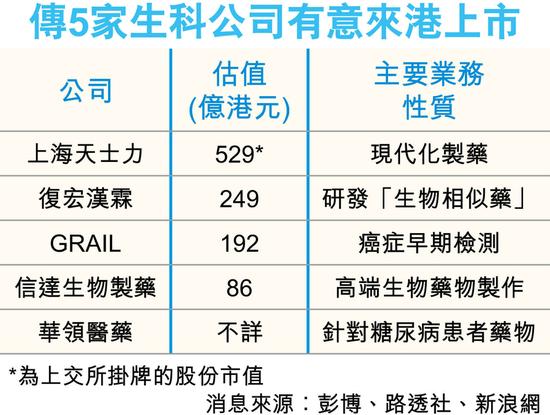 隨港交所發(fā)表咨詢文件,也陸續(xù)傳出有生物科技企業(yè)計(jì)劃在港上市,包括美資癌癥檢測(cè)公司Grail傳與顧問研究在香港上市事宜,計(jì)劃集資最多5億美元(詳見表)。