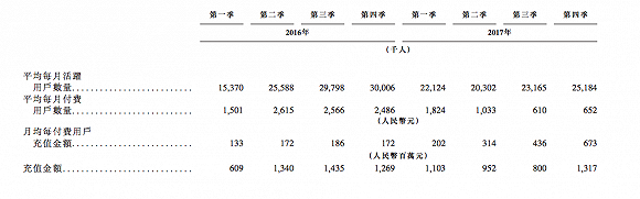 相對(duì)樂觀的是月均付費(fèi)用戶充值金額,2017年各個(gè)季度始終保持著環(huán)比增長(zhǎng),至2017年第四季度為673元,2017年第一至第三季度總體充值金額相比2016年同比有所下降,第四季度同比上升。
